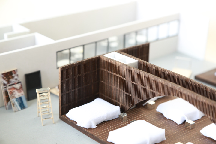 Working closely with client Aireloom, a luxury bedding manufacturer, the whole project was designed and executed in six weeks. A short modeling study that addressed spatial divisions and material transparency concluded with a series of wood slat dividers that provide a welcoming concave entry area, and a wide arch that ceremoniously centers two product lines while allowing open movement and visibility. One inch walnut stained poplar slats were used for the dividers. 3’ by 9’ Travertine marble slabs and blackened steel were also sourced and fabricated for a reception area in front of the showroom.